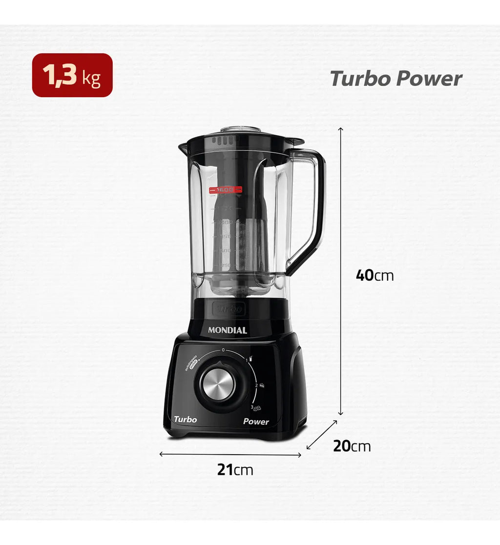 O liquidificador Mondial Turbo L-900 leva praticidade e potência para a hora de cozinhar. Ele reúne 900W, 2,7 litros de capacidade total e 5 velocidades. Com isso, você pode preparar grandes porções de pizza de liquidificador, pão de queijo, torta ou bolo de cenoura de liquidificador e outras receitas de uma só vez. Além disso, também vem acompanhado de filtro em inox para coar sucos e molhos direto no copo e sistema de encaixe rápido. Saiba mais sobre o L-900-FB: ALTA POTÊNCIA: 900W Permite que você misture ou triture suas receitas com maior agilidade. CAPACIDADE* TOTAL: 2,7 LITROS Que tal preparar sucos, molhos e outras receitas para toda a família? Com a jarra de 2,7 litros, você produz grandes porções de uma vez só e economiza seu tempo. *Capacidade Útil de 1,75L. LÂMINAS EM INOX Trituram com mais precisão e rapidez. Além disso, não enferrujam e são mais duráveis. JARRA RESISTENTE O copo do liquidificador Mondial é feito de San Cristal, material resistente a quedas e riscos, supertransparente e que não pega cheiro ou cor. COM FILTRO O filtro em Inox permite que sucos e molhos fiquem prontos sem semente ou bagaço. E sem precisar coar! SISTEMA DE ENCAIXE RÁPIDO Encaixe seguro e fácil do copo. 5 VELOCIDADES + PULSAR/GELO Escolha a velocidade ideal para alcançar a textura perfeita! A função Pulsar/Gelo tritura até os ingredientes mais duros, como gelo e poupa de fruta. FUNÇÃO AUTOLIMPEZA Higienização rápida e prática do seu liquidificador. TAMPA COM COPO DOSADOR Facilita a adição de ingredientes durante o preparo. JARRA: BPA FREE + SEM CHEIRO O material não contém Bisfenol-A, que é nocivo à saúde, e não deixa cheiro. Aviso legal • Livre de BPA.