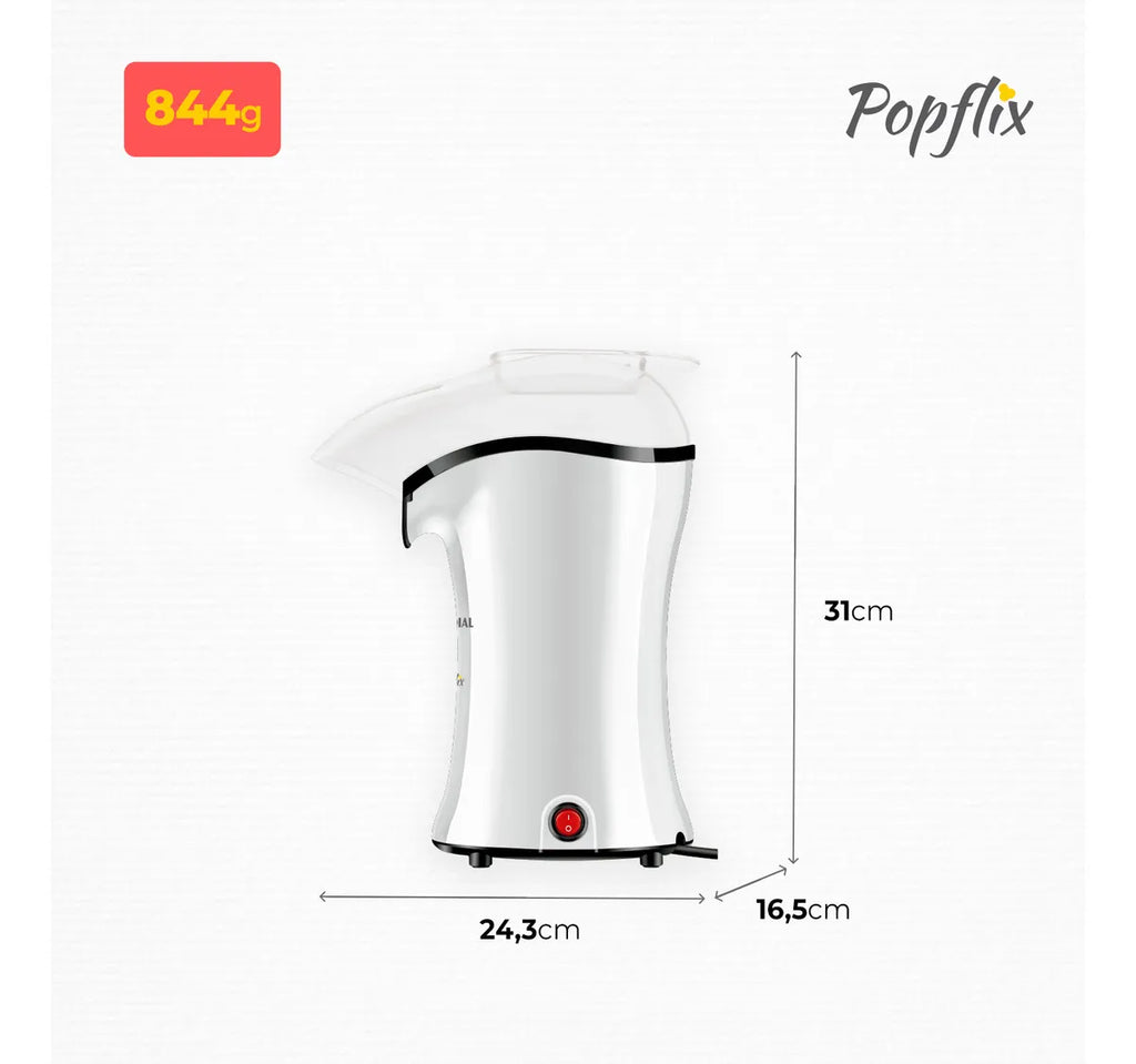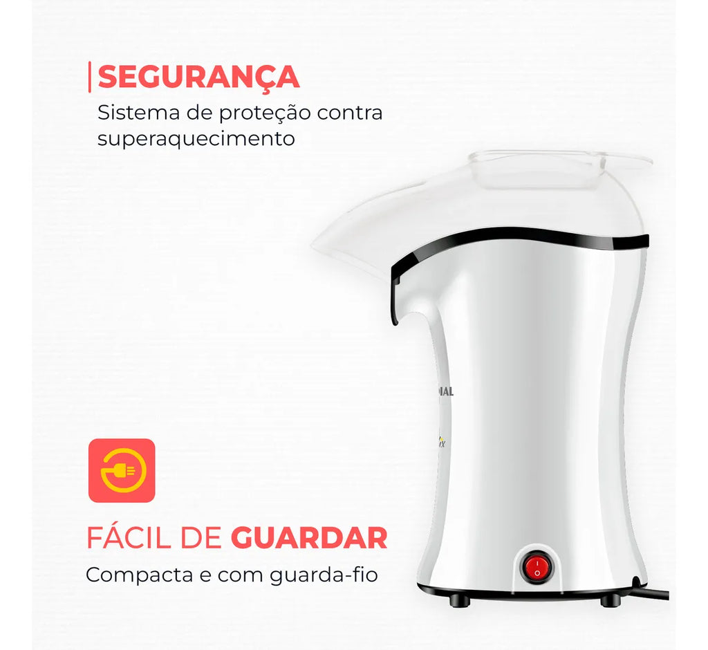 A pipoqueira Popflix da Mondial proporciona rapidez e praticidade no preparo da pipoca. Basta colocar o milho e ligar o aparelho: em menos de 3 minutos está pronta! E o melhor: sem adição de óleo ou outra gordura, pois o aparelho utiliza tecnologia de circulação de ar quente. Muito mais saudável, né? Saiba mais sobre a PP-04: PIPOCA PRONTA EM MENOS DE 3 MINUTOS Você nem escolheu o filme e a sua pipoca já está pronta! Basta colocar o milho e ligar o aparelho: em menos de 3 minutos, a pipoca está pronta e quentinha. MUITO MAIS SAUDÁVEL: SEM ÓLEO A pipoqueira Mondial utiliza a tecnologia de circulação de ar quente para que as pipocas estourem rapidamente. E o melhor: sem a necessidade de usar óleo ou qualquer tipo de gordura. BOCAL DIRECIONADOR Pipocas quentinhas direto no recipiente de sua preferência. CAPACIDADE É de 100g de milho por preparo. COLHER DOSADORA Te ajuda a medir a quantidade exata para o preparo. E ainda pode ser utilizada como reservatório para derreter a manteiga ou coberturas especiais com o calor do aparelho, enquanto as pipocas estouram. POTÊNCIA: 1.200W O milho estoura rapidamente e a pipoca fica pronta em menos de 3 minutos. + SEGURANÇA As pipoqueiras Mondial contam com sistema de proteção contra superaquecimento excessivo. COMPACTA E FÁCIL DE GUARDAR A Popflix ocupa pouco espaço e possui a função guarda-fio, que facilita na hora de armazenar. A Mondial é a escolha de milhões de consumidores. Mondial, a escolha inteligente!